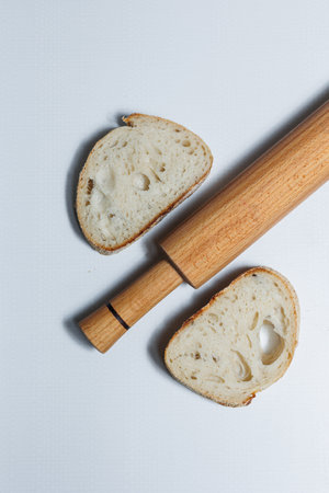 Slender white bread stick crossed on smooth light background. Simple and elegant presentation emphasizing bread's texture. Concept of bakery, culinary arts, food photography.