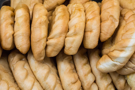 Delicious fresh baked fragrant white pastry bread from central Europe, called Rohlik in Czech. Filled frame texture.
