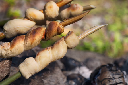 Grilling meat and bread on skewer over the brazier.