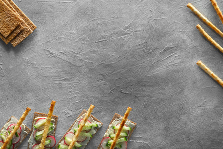 Food photography. Delicious rye crispbreads with cream cheese, cucumber, radish and breadsticks on light gray textured table, flat lay with space for text