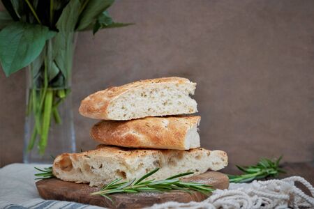Sliced focaccia sour dough bread, dark background