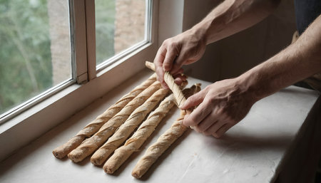The man binds the grissini with an eco-friendly rope. A set of breadsticks