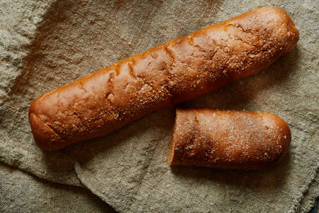 Loaf of bread on white table, food closeup