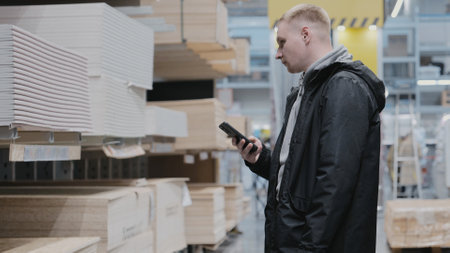 A man in a hardware store chooses building materials. The buyer in the store chooses chipboard. Buying plywood at a hardware store. Blockboards in a hardware store