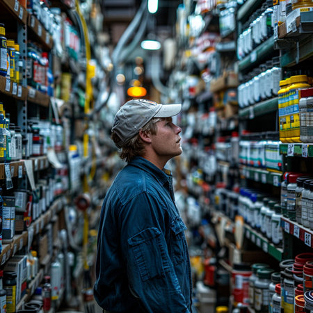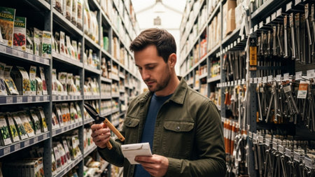 An environmental, cinematic wide shot capturing a man shopping intensely for specialized gardening e