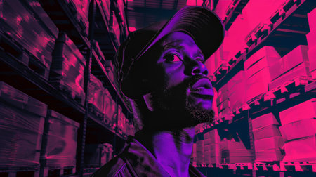 Portrait of African American worker in warehouse, International export business concept telephoto lens magic realism black light
