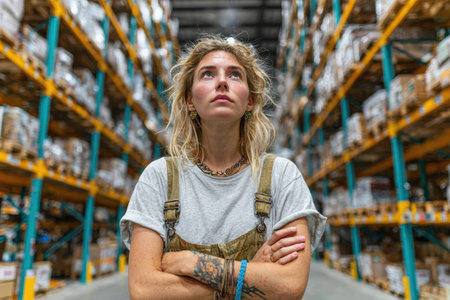Female warehouse worker stands confidently in a storage facility, surrounded by shelves filled with boxes, showing a strong work environment.