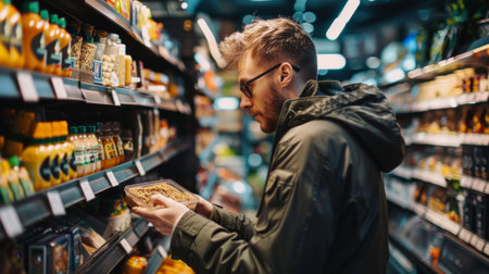 A man browsing and choosing products in a supermarket aisle. The image captures the shopping experience, highlighting the variety and selection of goods available.