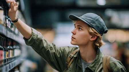 side view of young man in cap looking at bottle of wine in supermarket