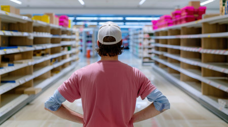 A man stands at the end of an empty grocery aisle, observing the shelves with a reflective expression. The scene captures the retail experience amidst a shortage.
