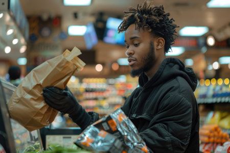 A young man looks stressed while shopping in a supermarket possibly due to high prices or overwhelming choices. Concept Supermarket Shopping, Stressful Experience, High Prices, Overwhelming Choices