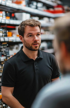 Electrician in black polo shirt talks to customer in electronics store, discussing electrical components