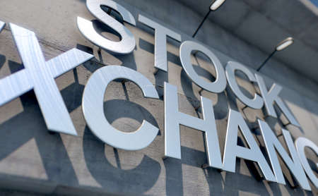 A 3D render of laser cut signage above the entrance to a modern generic stock exchange building composed of exposed concrete in the day time