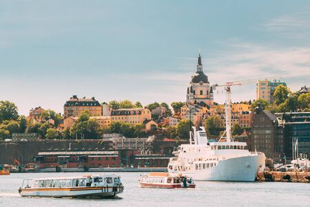 STOCKHOLM, SWEDEN - JULY 11, 2018: Boats for sightseeing and ferry for long distance travel in front of Stockholm skyline at Stadsgardskajen on July 11, 2018 in Stockholm, Sweden.