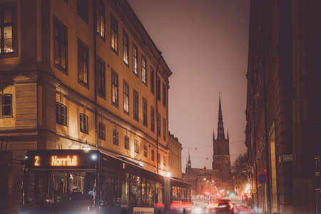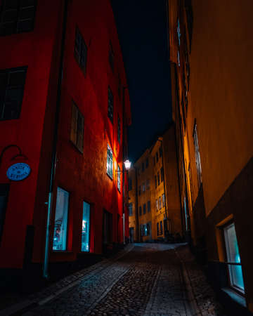 Beautiful cozy night narrow street in Gamla Stan - old town of Stockholm. 14 February 2020, Stockholm Sweden