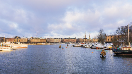 STOCKHOLM, SWEDEN - MARCH 30, 2016: View with the Stockholm harbor, tourist ships and old buildings from the city center