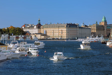 Stockholm, Sweden. Grand Hotel Located On The Peninsula Blasieholmen. Touristic Pleasure Boats Floating Near Famous Grand Hotel In Sunny Summer Day.
