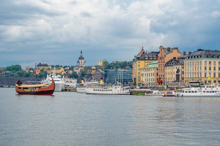 STOCKHOLM, SWEDEN - JULY 11, 2018: Boats for sightseeing and ferry for long distance travel in front of Stockholm skyline at Stadsgardskajen on July 11, 2018 in Stockholm, Sweden.