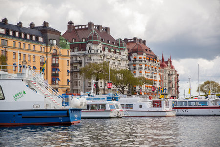 Stockholm, Sweden - May 20, 2015: Moored ferries and boats by Strandvagen boulevard in Stockholm