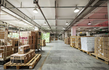 Background photo interior warehouse with carton box retail stock or postal center