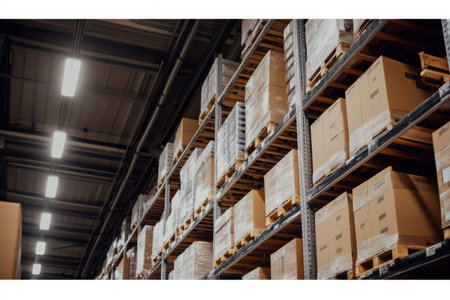 This interior shot presents a warehouse scene, showcasing neatly stacked packages under bright, overhead lights. The composition features a symmetrical arrangement with a focus on the packed inventory. The industrial aesthetic, enhanced by a cool color palette, suggests a setting for distribution and storage, suitable for commercial purposes.