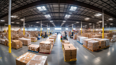 Vast logistics warehouse brimming with boxes, parcels, and merchandise ready for distribution
