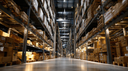 An interior shot reveals a large warehouse filled with rows of stacked cardboard boxes on shelving units. The scene utilizes a wide-angle perspective to emphasize the expansive storage area. The image displays a cool color palette with artificial lighting and glossy flooring. Suitable for logistics, supply chain, and storage concepts.