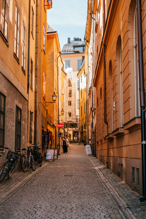Stockholm, Sweden - June 28, 2019: Old narrow streets and yellow buildings of Stockholm.