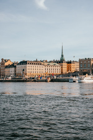 Beautiful buildings at the bank of the strait in the downtown of Stockholm, Sweden.