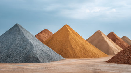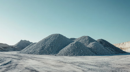 This image features an industrial construction site with various heaps of gravel and sand under a clear sky, emphasizing the natural textures and materials of the earth.