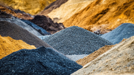 Vibrant mineral heaps create a visually striking landscape in a gravel yard. The various colors and textures highlight the raw materials used in construction and industry.