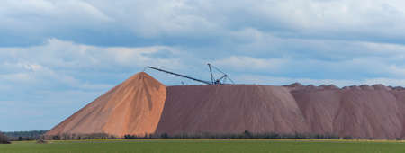 Giant spreader or absetzer machinery. A large dumper on a landfill with potash ore. Extracting and mining potassium salts. Large excavator machine and waste ore in the extraction of potassium.