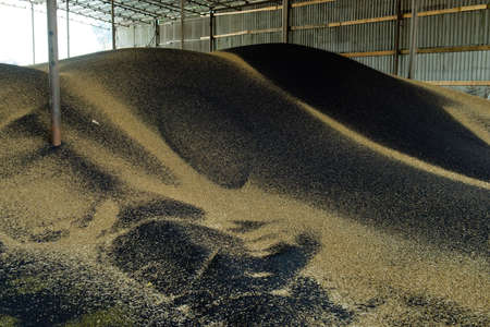 A large pile of golden grains sits in an industrial warehouse, illuminated by natural light. The textured walls create an atmospheric backdrop, highlighting the harvested crop.