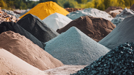 A vibrant display of various construction materials showcases different colors and textures in a natural landscape. The image captures piles of gravel, sand, and soil.