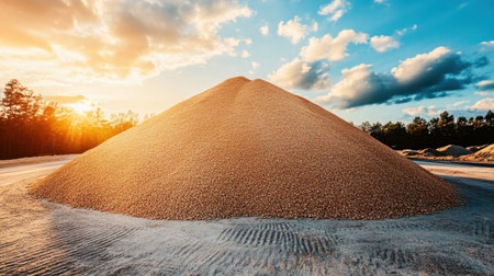 A large pile of gravel rises against a dramatic sky, showcasing the natural beauty of the landscape. The image captures the serenity of an open area during sunset.