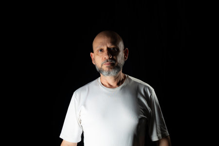 Portrait of bearded and bald man against black background.
