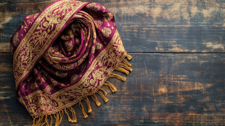 Discover the beauty of this elegant purple and gold scarf, featuring intricate designs set against a rustic wooden background. Perfect for fashion and decor.