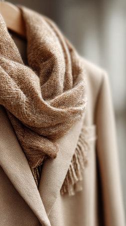 This scene features a close-up of a beige wool blazer paired with a textured scarf. The focus is on the fabric details, showcasing autumn fashion. Soft light highlights the textures.