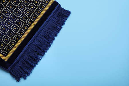 Muslim prayer rug on light blue background, top view. Space for text