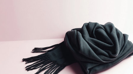 photo of a folded black scarf with fringed edges, placed at the lower-left corner of a pale lavender background. The upper space is empty, ready for text or mockup, isolated on pale lavender background --no people man woman --chaos 12 --ar 16:9 --style raw --stylize 250 --weird 150 --v 6.1 Job ID: 27bda65e-fa6d-4f0c-803e-e164677d5536