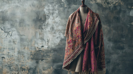 A stunning shawl elegantly styled on a mannequin, highlighting its rich textures and colors against a beautifully textured wall, ideal for fashion and textile enthusiasts.