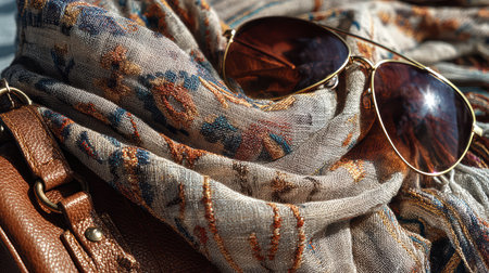 A chic ensemble featuring a stylish scarf and sunglasses resting on warm brown leather. Perfect for fashion photography and lifestyle imagery.
