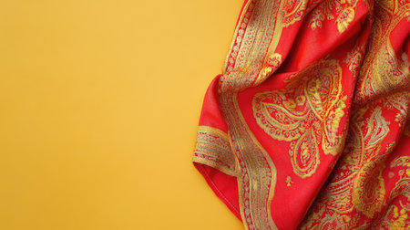 A beautifully draped red scarf featuring an intricate golden pattern against a vibrant yellow background, highlighting elegance and artistic design.