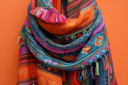 A beautifully crafted and colorful scarf showcases vibrant hues and a soft texture, ideal for adding warmth and style to winter outfits and seasonal fashion expressions.