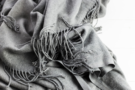 Background texture of the crumpled gray winter fashionable female scarf. On a white wooden table