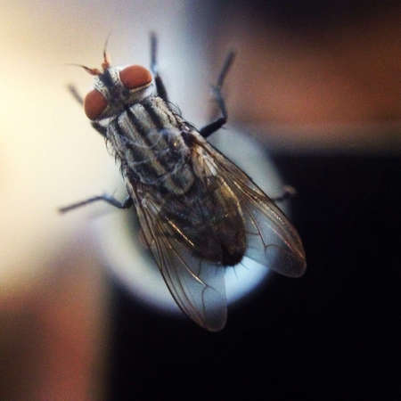 Picture taken using a macro lens. Fly stuck on mirror as I focus the camera lens on it.