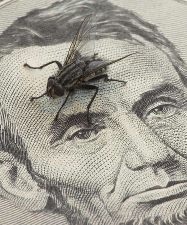 Economical crisis - dead housefly on the one dollar bill, close-up view.