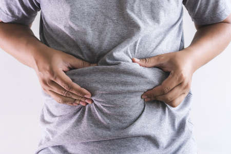 Close up of Man touching his fat belly, Men's hand holding excessive belly fat. Being overweight is one of the leading causes of major diseases such as heart disease, stroke, high blood pressure.