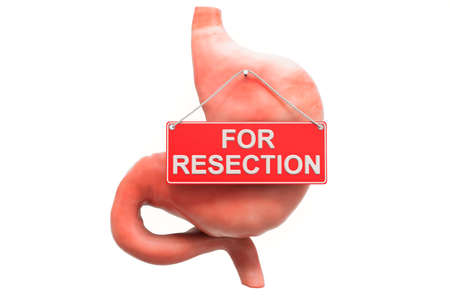 Gastric resection concept. Human stomach with For Resection hanging sign, 3D rendering