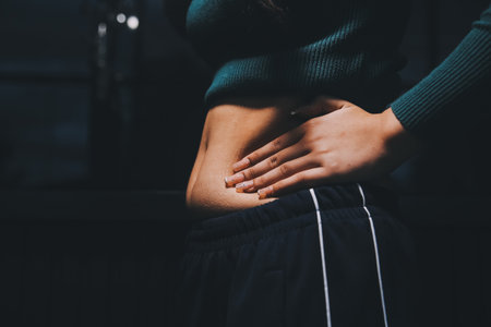 Highlighted stomach organ low key illustration. Woman body on dark green background. Immune system detox, probiotic and enzymes concept.
